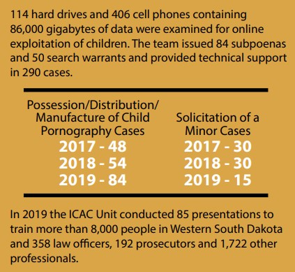 The Forensic Computer Unit was created in 2011 to investigate internet and computer crimes. This unit is comprised of Investigators from the Pennington County Sheriff’s Office, Detectives from Rapid City Police Department and Agents with the State Division of Criminal Investigations.